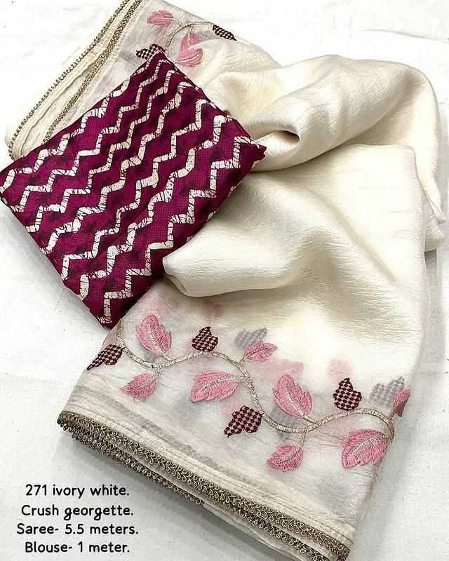 Ivory White Crush Georgette Saree Multi Embroidery Work